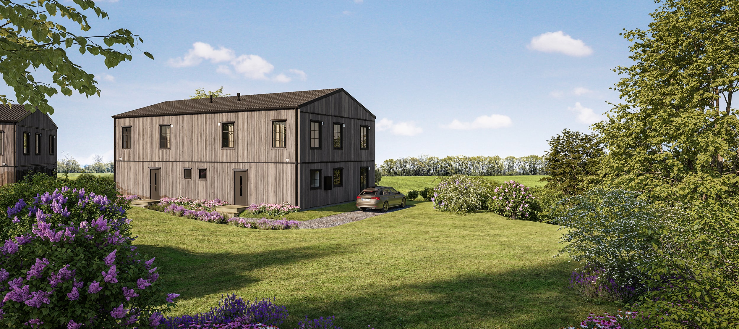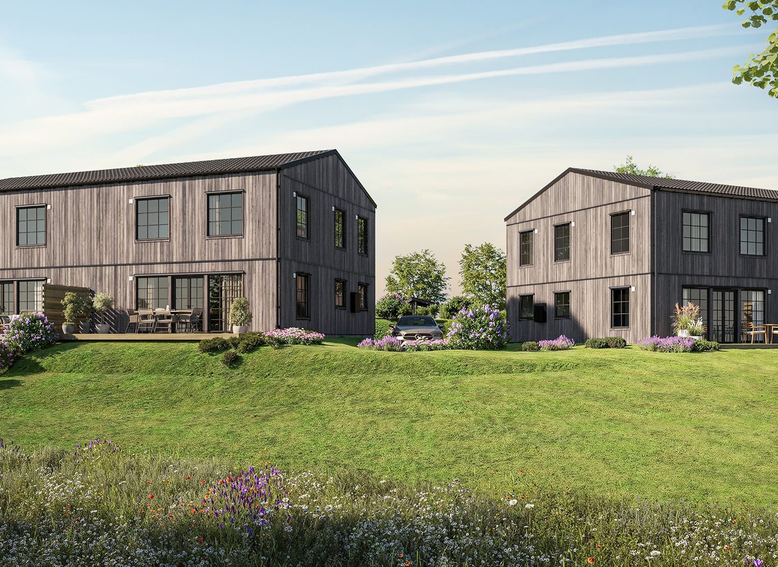 Varje bostad kommer ha sin egen tomt med plats för parkering, odling och lek. På tomten återfinns även förrådsbyggnaden.